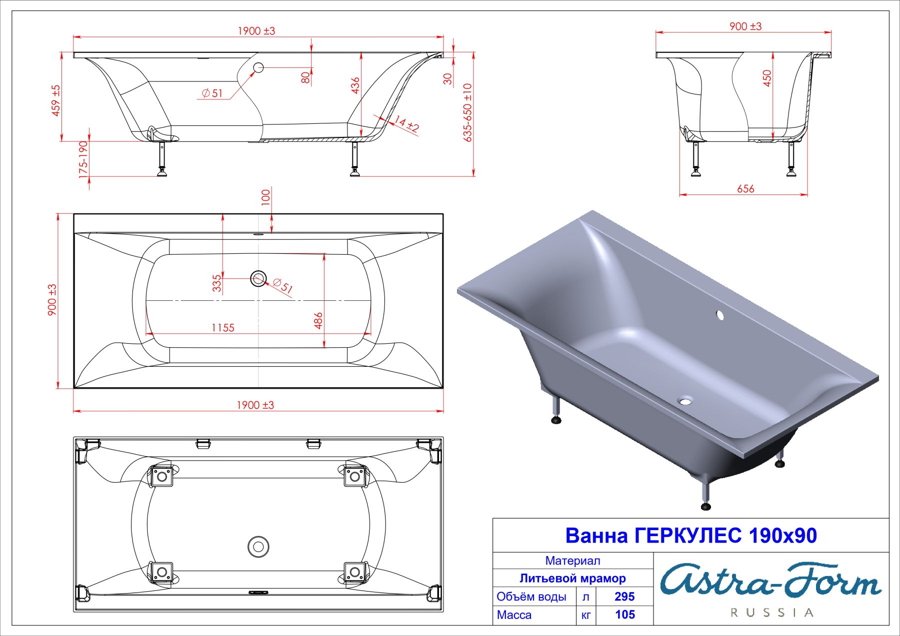 Ванна из искусственного камня Astra-Form Геркулес 01010016 190x90 см белый глянец