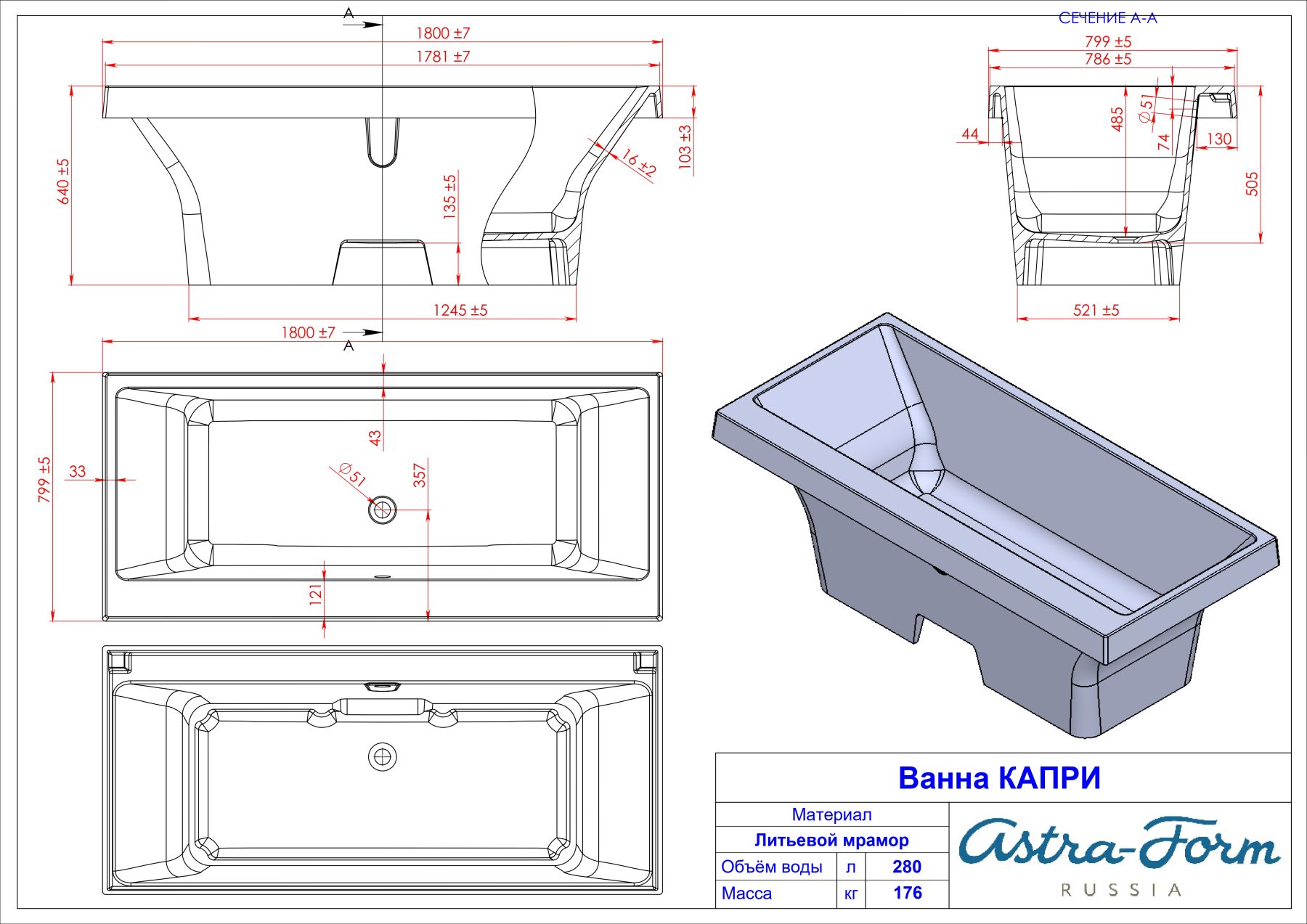 Ванна из искусственного камня Astra-Form Капри 01010087 180x80 см белый матовый купить