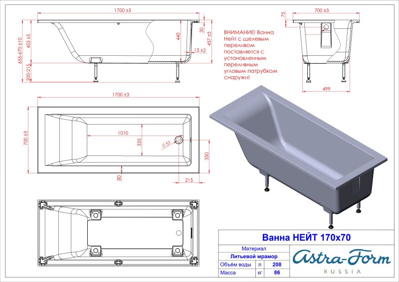 Ванна из искусственного камня Astra-Form Нейт 01010041+08010053 170x70 см с щелевым переливом донный клапан белый глянец купить
