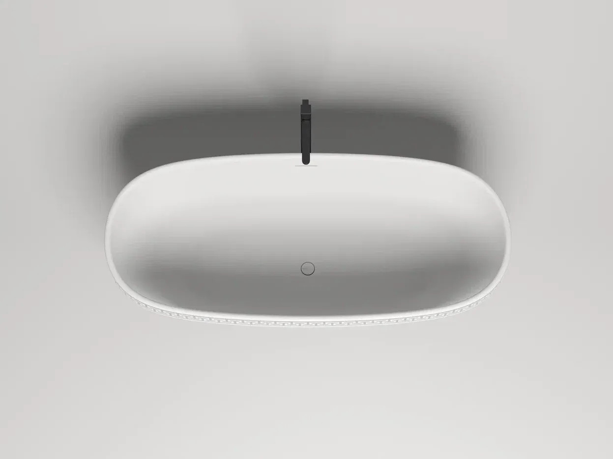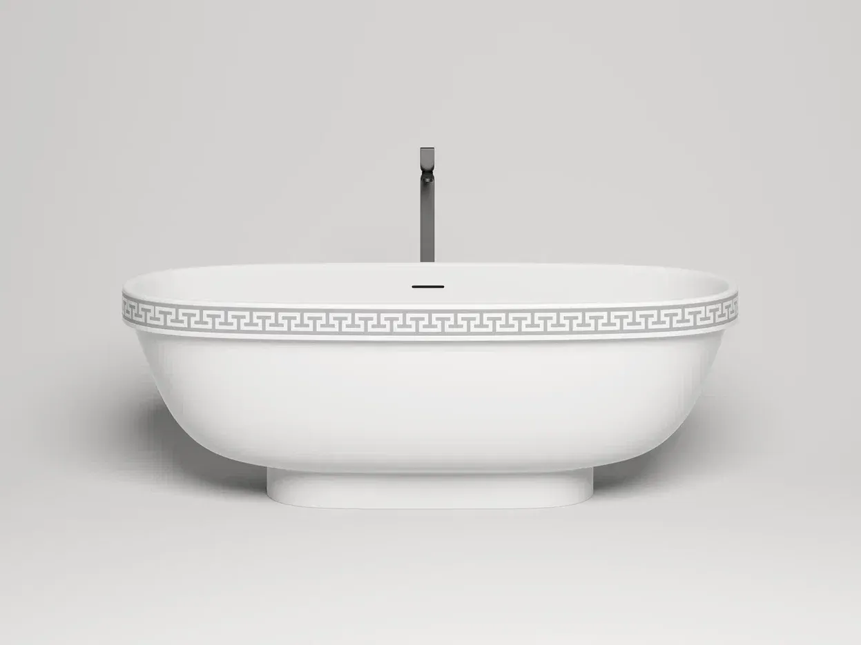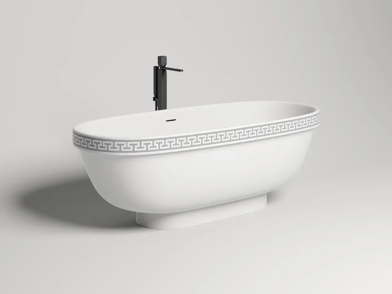 Ванна предлагается в двух версиях — с гладким бортом и бортом, украшенным классическим древнегреческим орнаментом. Полоса орнамента «меандр» из материала S-Shine на основе эпоксидной смолы интегрирована в борт ванны, она прокрашивается в глубину любым цветом палитры RAL Classic. Такой орнамент не сотрётся со временем и никогда не выйдет из моды, как и сама модель классических пропорций.