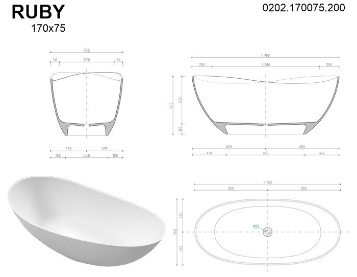 Ванна из искусственного камня Whitecross Ruby 0202.170075.200 170x75см белый матовый