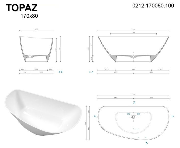 Ванна из искусственного камня Whitecross Topaz 0212.170080.100 170x80см белый глянец