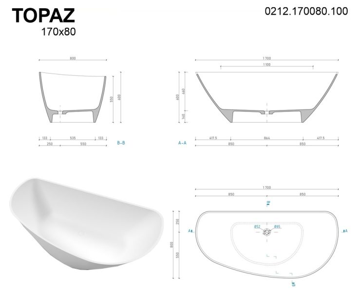Ванна из искусственного камня Whitecross Topaz 0212.170080.200 170x80см белый матовый