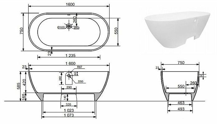 Ванна из литьевого мрамора Эстет Майами ФР-00009623 160x75см белый