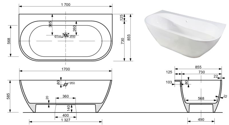 Ванна из литьевого мрамора Эстет Майами ФР-00010630 170x85см белый