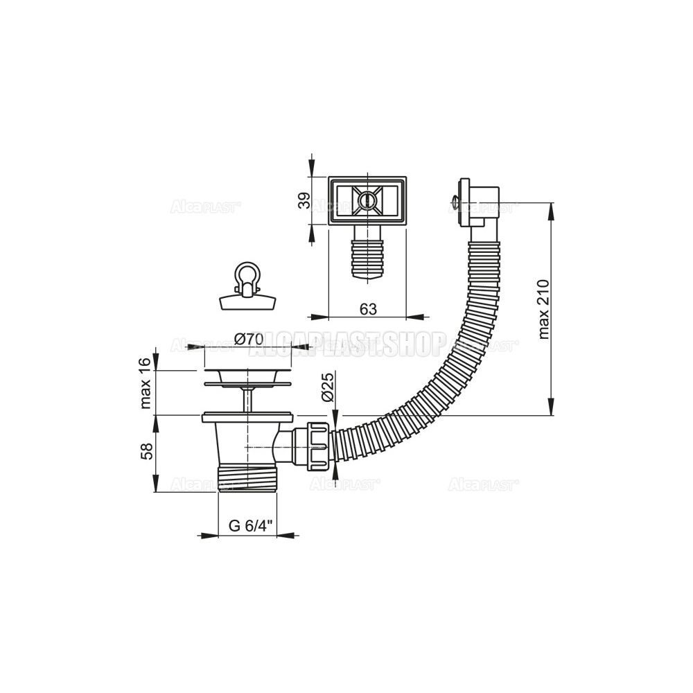 Водослив сифона для мойки AlcaPlast 6/4" с нержавеющей рeшeткой ?70 и гофропереливом A331