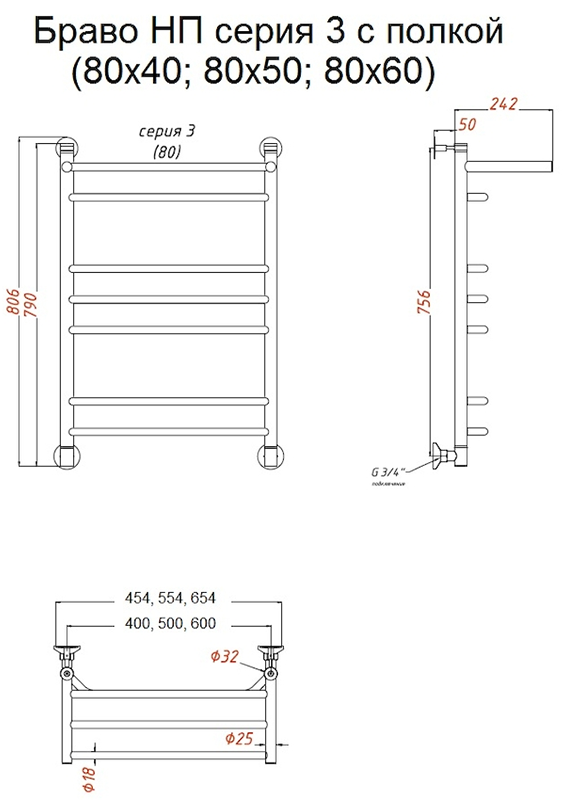 Водяной полотенцесушитель Тругор Браво НП 3 П с полкой 80x60см хром Браво3/нп8060П