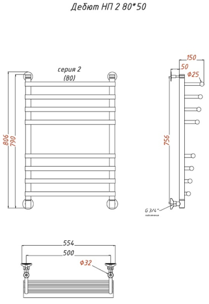 Водяной полотенцесушитель Тругор Дебют НП 2 80x50см хром Дебют2/нп8050