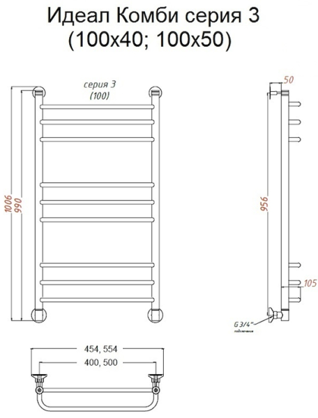 Водяной полотенцесушитель Тругор Идеал комби НП 3 100x50см хром Идеал/комби3/НП10050