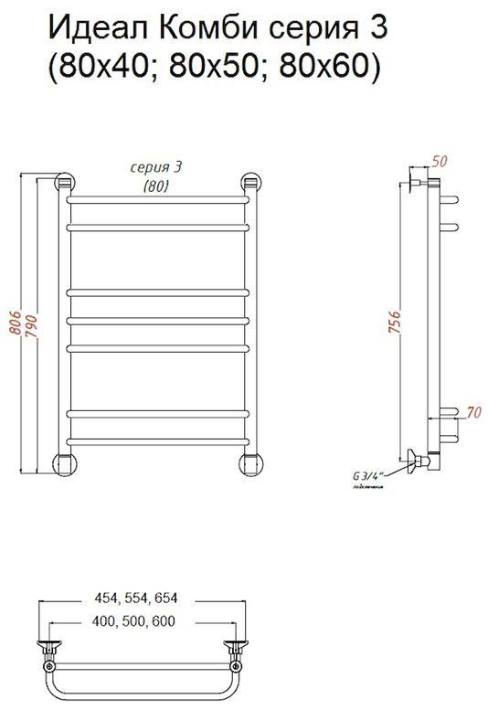 Водяной полотенцесушитель Тругор Идеал комби НП 3 80x50см хром Идеал/комби3/нп8050