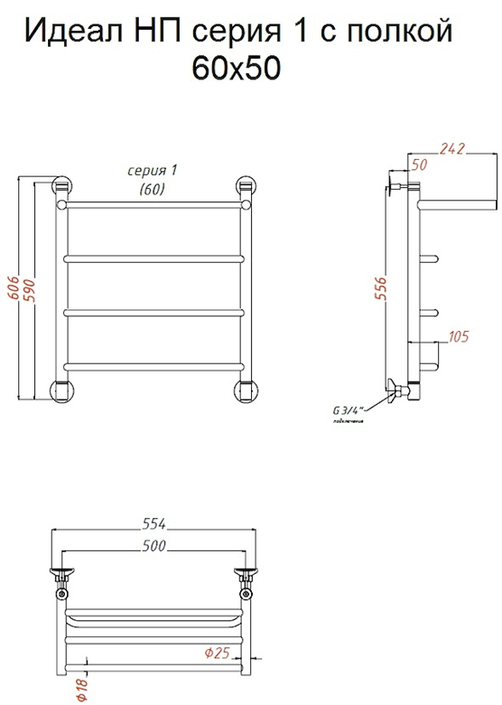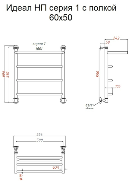 Водяной полотенцесушитель Тругор Идеал НП 1 П с полкой 60x50см хром Идеал1/нп6050П