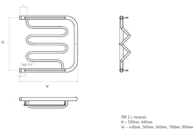 Водяной полотенцесушитель Тругор ПМ2 с полкой 50x50см хром ПМ2/5050П