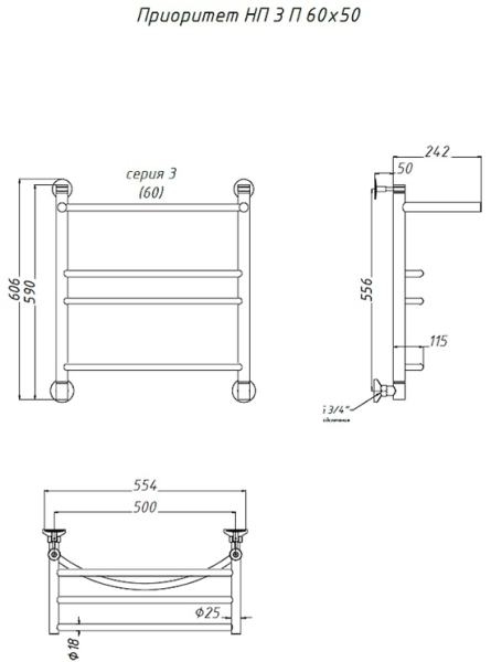 Водяной полотенцесушитель Тругор Приоритет НП 3 П с полкой 60x50см хром Приоритет3/нп6050П