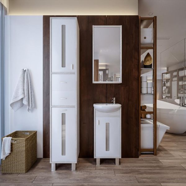 Внутреннее содержание шкафа умело организовано: разнообразные полки и отсеки позволяют удобно разместить все необходимые аксессуары – от косметики до бытовой химии. Зеркало, интегрированное в фасад, визуально расширяет пространство и облегчает утренние рутинные процедуры.