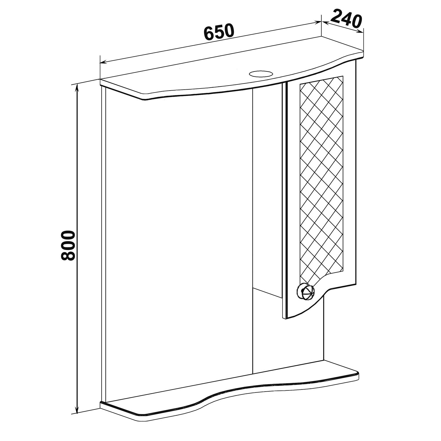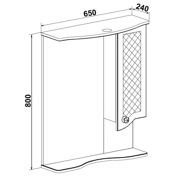 Зеркальный шкаф оборудован одним врезным светодиодным светильником 220В и розеткой с выключателем. Справа - шкафчик с распашной дверцей и одной внутренней полкой. Под зеркалом - нижняя полка. Петли со встроенным доводчиком, ручка - 1шт. Выпускается только в правом исполнении.