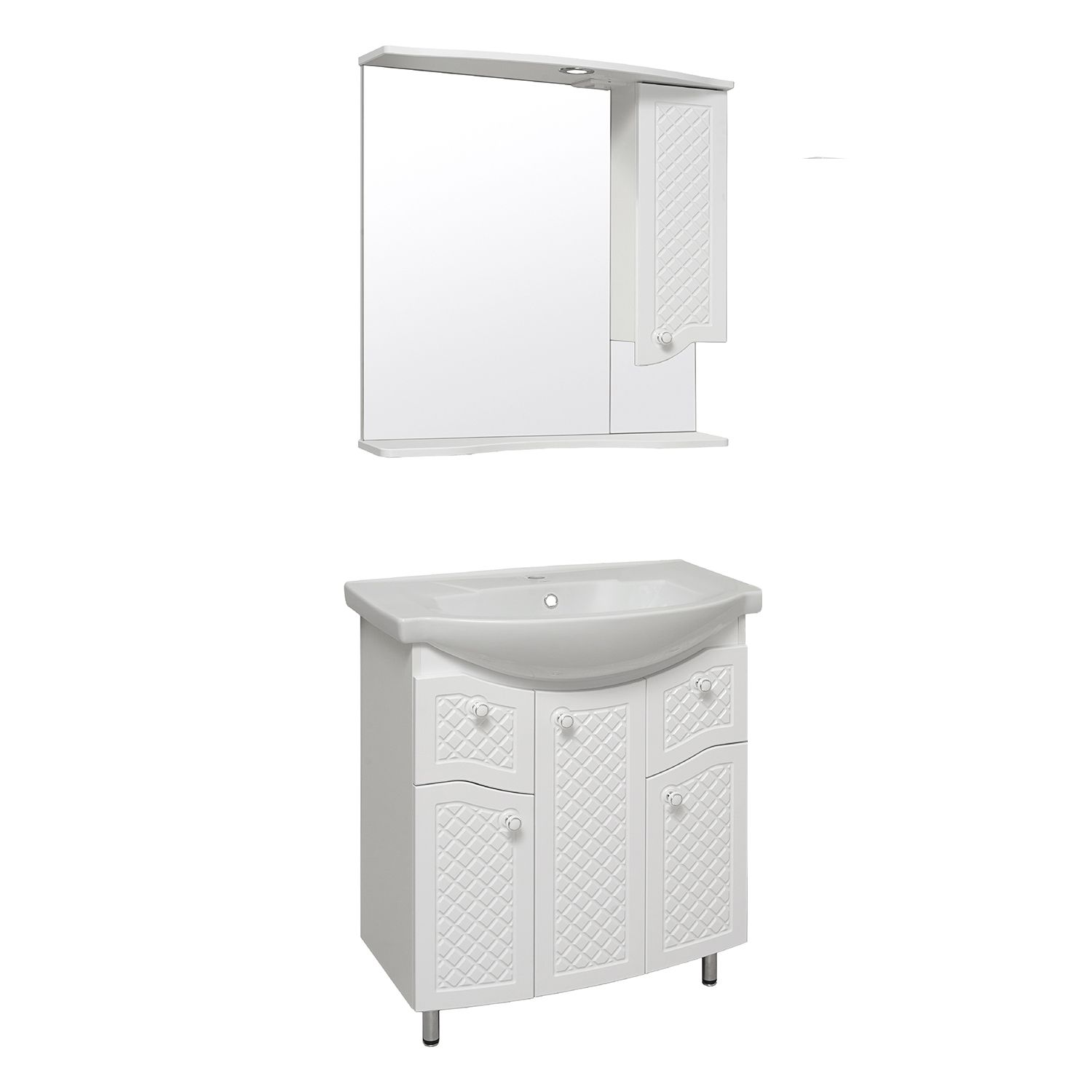 Зеркальный шкаф оборудован одним врезным светодиодным светильником 220В и розеткой с выключателем. Справа - шкафчик с распашной дверцей и одной внутренней полкой. Под зеркалом - нижняя полка. Петли со встроенным доводчиком, ручка - 1шт. Выпускается только в правом исполнении.