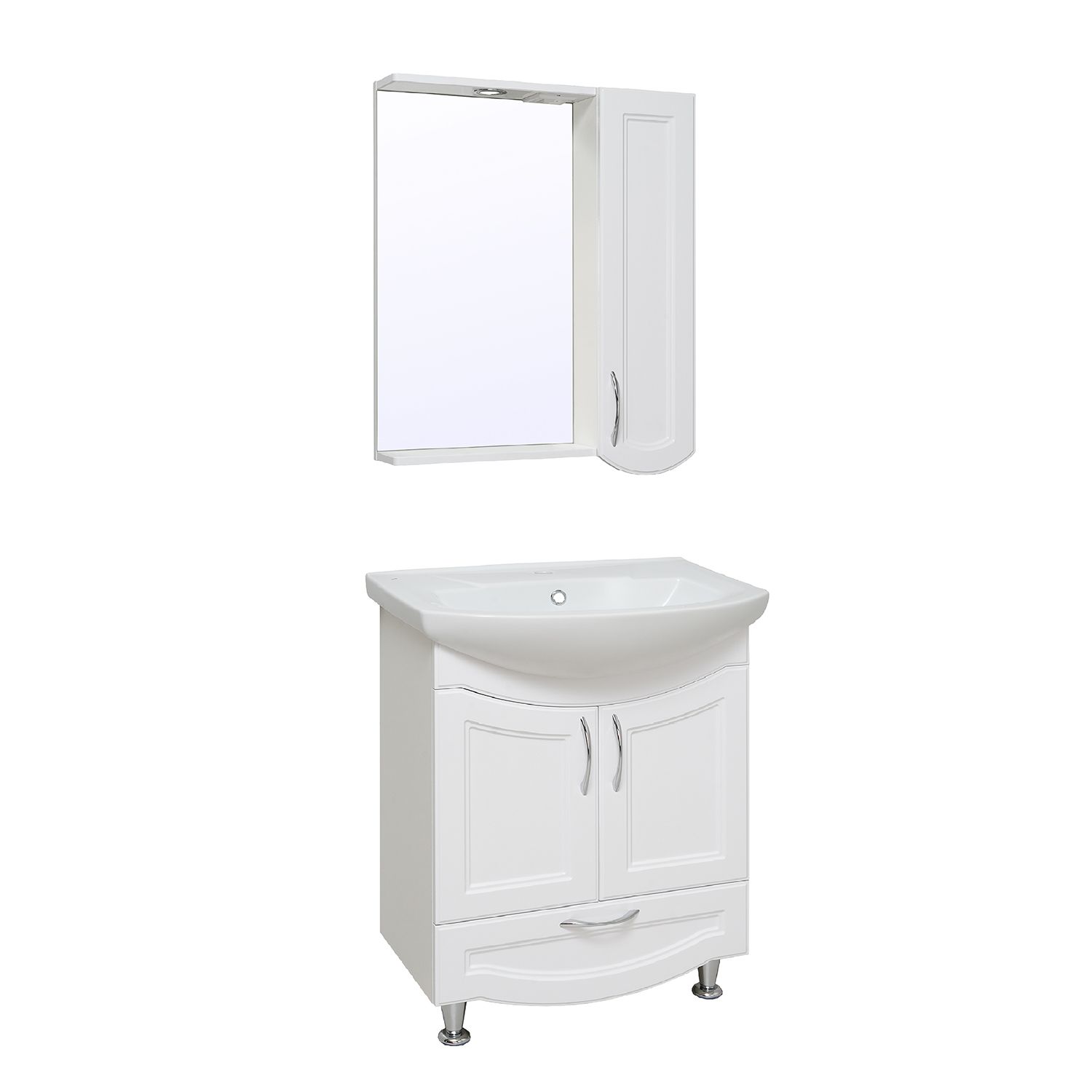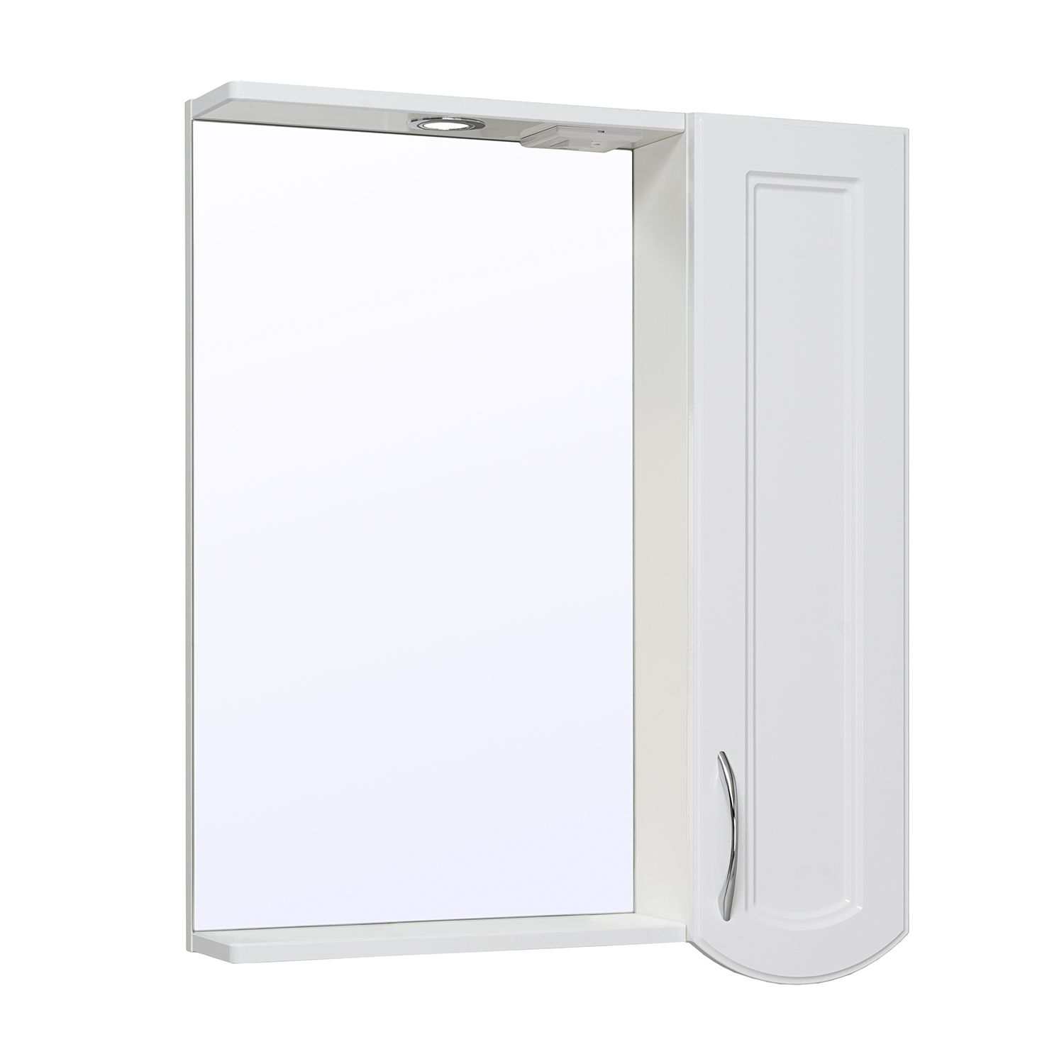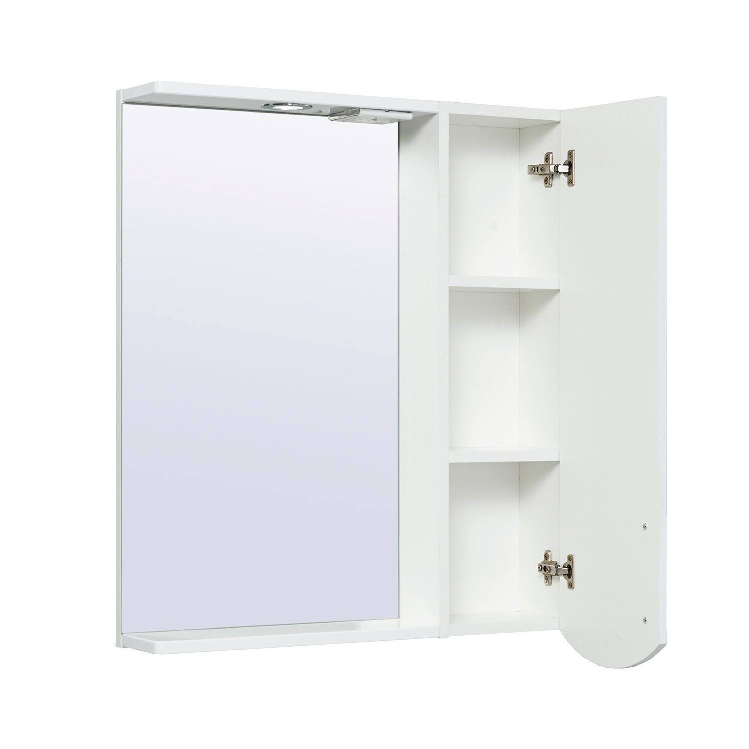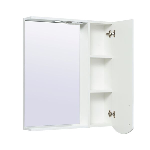 Зеркальный шкаф оборудован одним врезным светодиодным светильником 220В и розеткой с выключателем. Справа - шкафчик с распашной дверцей и двумя внутренними полками. Петли со встроенным доводчиком, ручка - 1шт. Выпускается только в правом исполнении.
