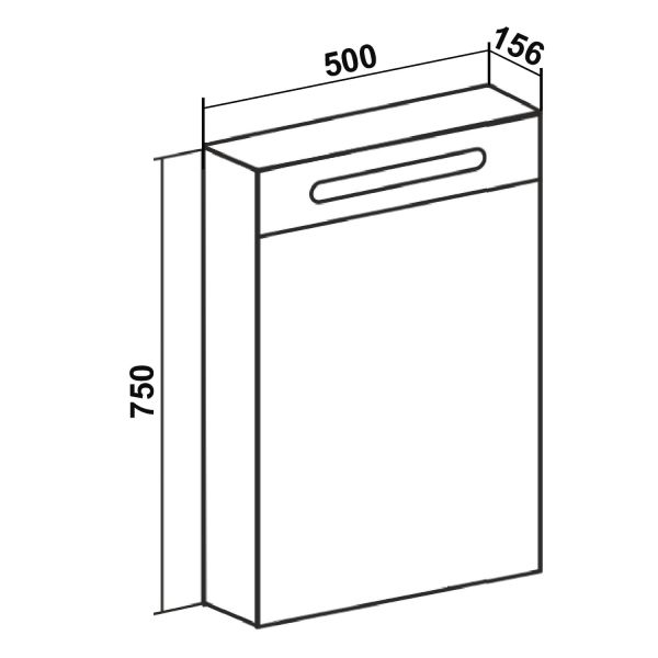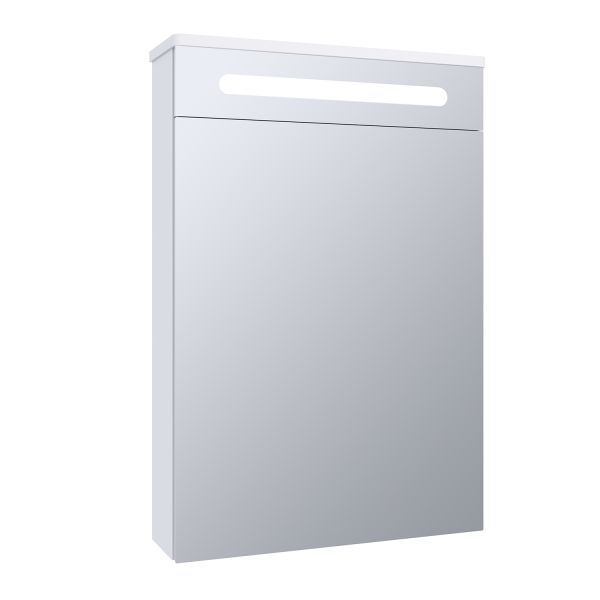 Зеркальный шкаф со встроенной сверху люминесцентной подсветкой и с распашной зеркальной дверкой. Блок розетка/выключатель расположен внутри шкафа. Петли со встроенным доводчиком. Выпускается только в правом исполнении.