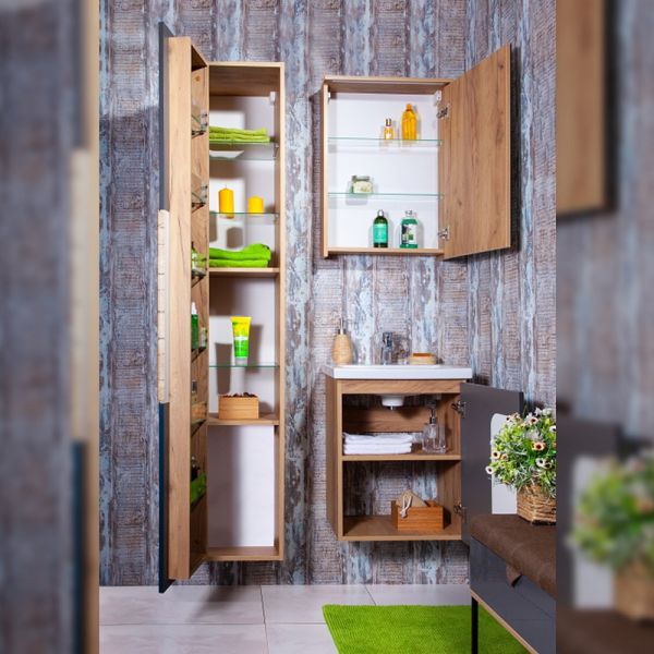 Внутреннее содержание шкафа умело организовано: разнообразные полки и отсеки позволяют удобно разместить все необходимые аксессуары – от косметики до бытовой химии. Зеркало, интегрированное в фасад, визуально расширяет пространство и облегчает утренние рутинные процедуры.