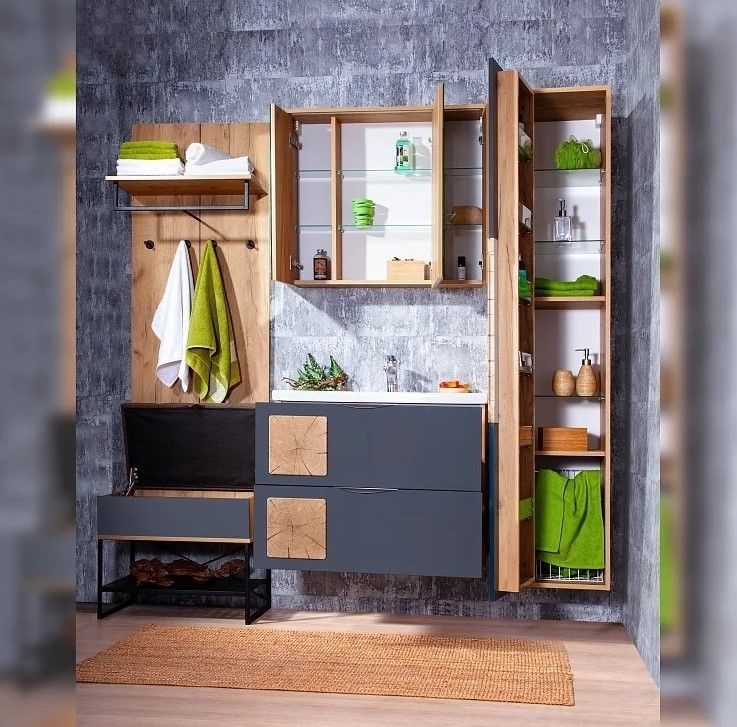 Внутреннее содержание шкафа умело организовано: разнообразные полки и отсеки позволяют удобно разместить все необходимые аксессуары – от косметики до бытовой химии. Зеркало, интегрированное в фасад, визуально расширяет пространство и облегчает утренние рутинные процедуры.