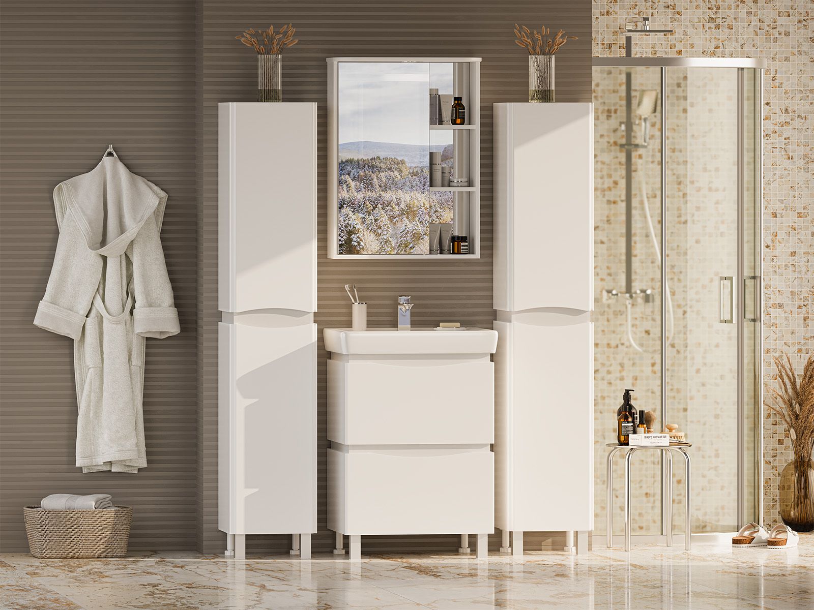 Зеркальный шкаф для ванной комнаты – это стильный акцент, который может преобразить любое пространство. С его элегантными линиями и продуманным дизайном, он идеально вписывается в современный интерьер. Внешняя поверхность шкафа, выполненная из качественных материалов, отражает свет, создавая ощущение простора и уюта.Внутреннее содержание шкафа умело организовано: разнообразные полки и отсеки позволяют удобно разместить все необходимые аксессуары – от косметики до бытовой химии. Зеркало, интегрированное в фасад, визуально расширяет пространство и облегчает утренние рутинные процедуры.Зеркальный шкаф для ванной комнаты – это идеальное сочетание красоты и практичности, которое станет незаменимым помощником в вашем дневном ритме.