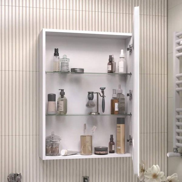 Зеркальный шкаф VIGO Geometry 220, 60 см. 1 дверца, петли с механизмом доводчика, 2 стеклянных полки, светодиодная подсветка по периметру, бесконтактное включение (на взмах), функция антизапотевания.