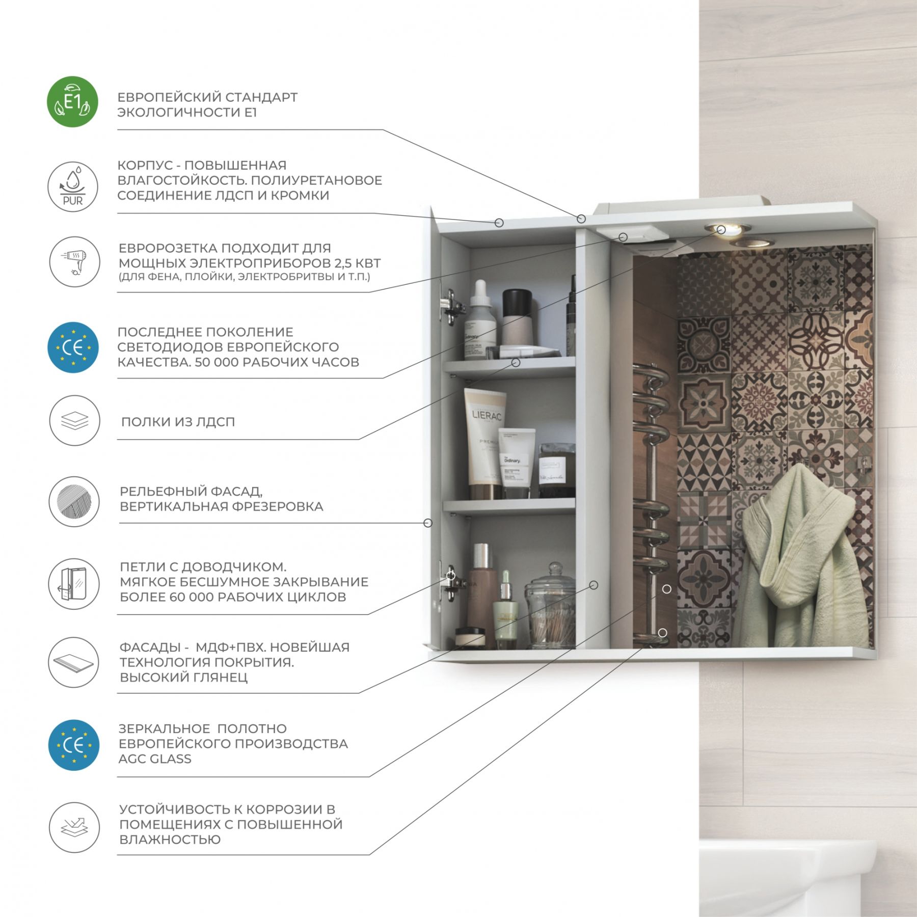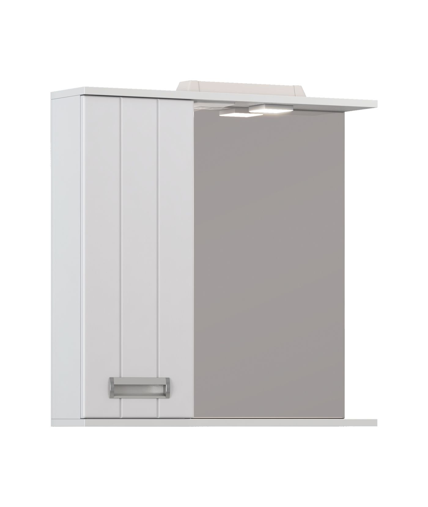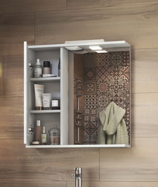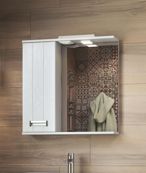1 дверца; 2 полки ЛДСП; ручка металлическая хромированная; 1 светодиодный светильник, включатель с розеткой.
