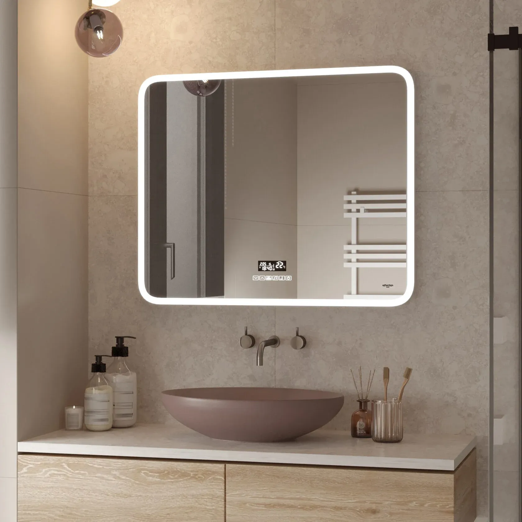 Предлагаем вашему вниманию зеркало с LED подсветкой, медиасистемой с Bluetooth, FM приемником часами, термометром и системой антипар Reflexion Party 900х700