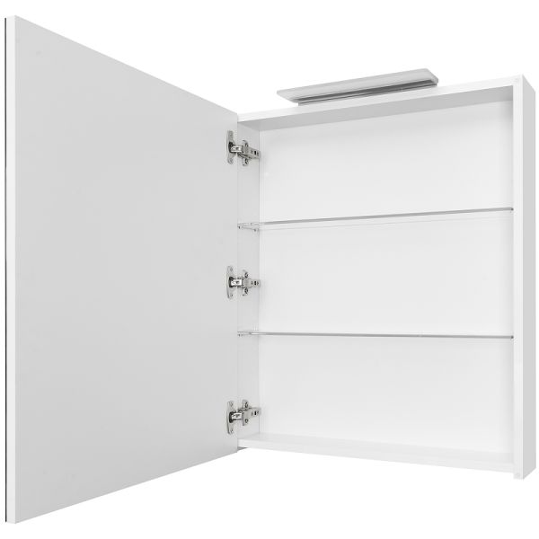 Зеркальный шкаф OLETA оснащен светильником от европейского бренда Ebir с возможностью регулировки положения, IP 44, 5 700 K. Теплота света у светильника 5 700 K – это яркий свет, идеальный для нанесения макияжа и бритья. Положение светильника можно регулировать: наклонить слегка вниз или направить свет повыше. За зеркальными фасадами расположены регулируемые по высоте полочки из просветленного стекла. Фасады оснащены петлями Hettich с плавным закрыванием.