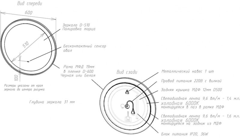 • Диаметр зеркала без обода: 510 мм
