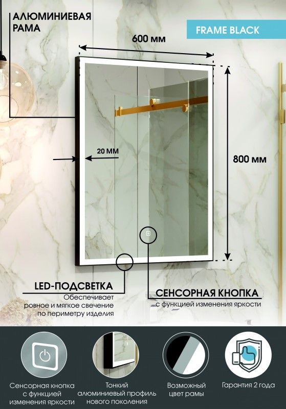 Зеркало "Frame Black LED" 600х800LED подсветка 6000Ксенсорный выключателькороб из алюминиевого профиля черного цвета