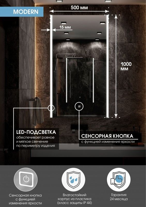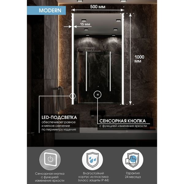 Зеркало "Modern Led" 500х1000 LED подсветка 6000К; сенсорный выключатель с функцией димирования