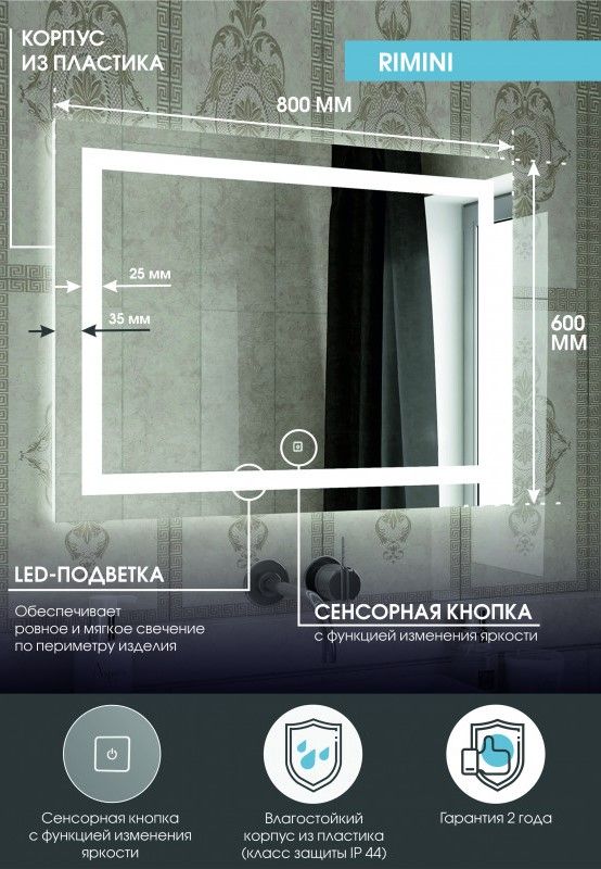 Зеркало "Rimini Led" 800х600LED подсветка 6000Ксенсорный выключатель с функцией димирования