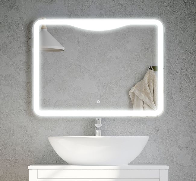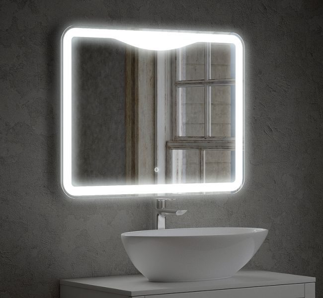 Зеркало "Орли" шириной 800 мм, высотой 600 мм. С отступом в 10 мм от края по всему периметру зеркала идёт область пескоструя шириной в 30 мм. Углы скруглены. Сверху зеркала - пескоструй в форме "чёлочки". Подсветка этой области осуществляется при помощи нажатия кнопки. Существует возможность регулировки освещенности (делать подсветку ярче или темнее). LED-подсветка, сенсорный выключатель с регулировкой яркости. Класс защиты: IP67. Класс энергетической эффективности: A++. Серебряное зеркало, стекло высшего качества M1. AC/DC трансформатор.