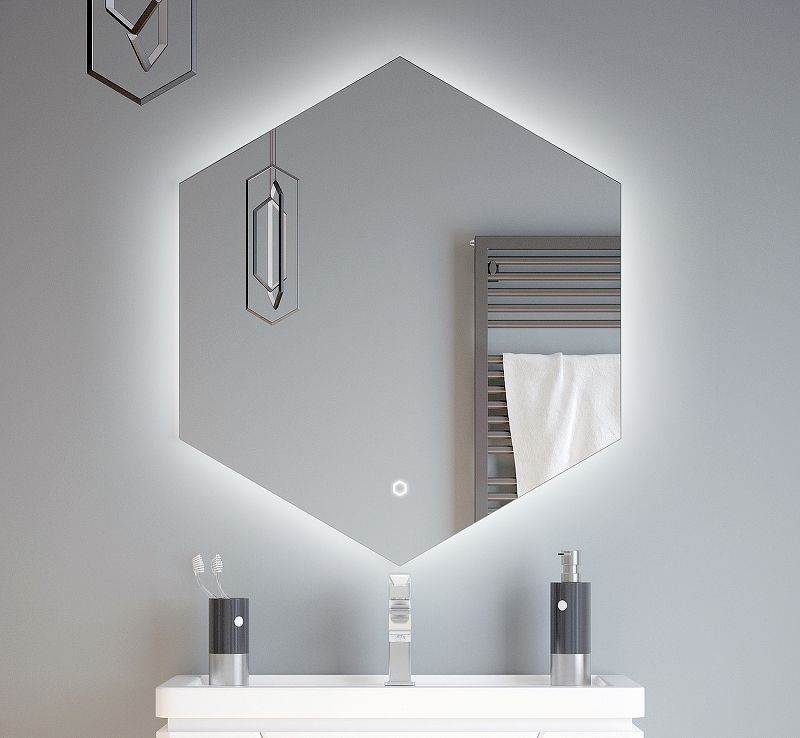 Зеркало "Теор" оснащено LED-подсветкой, сенсорным выключателем с регулировкой яркости. Класс защиты: IP67. Класс энергетической эффективности: A++. Серебряное зеркало, стекло высшего качества M1, 6 граней. AC/DC трансформатор. Опция внешней LED-подсветки. Ширина 700, высота 800 мм. Правильный 6-гранник. Осуществляется подсветка зеркала по всему периметру СЗАДИ. Существует возможность регулировки освещенности (делать подсветку ярче или темнее).