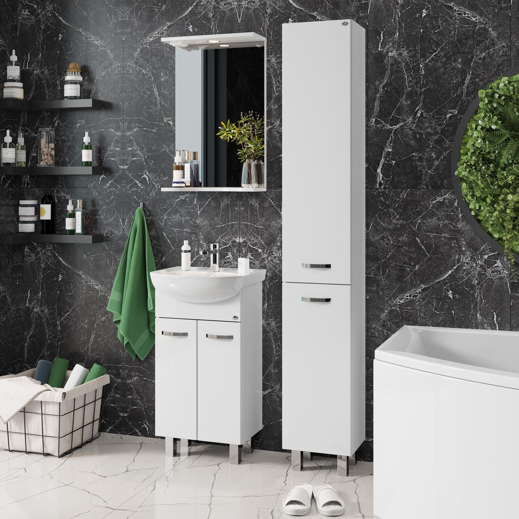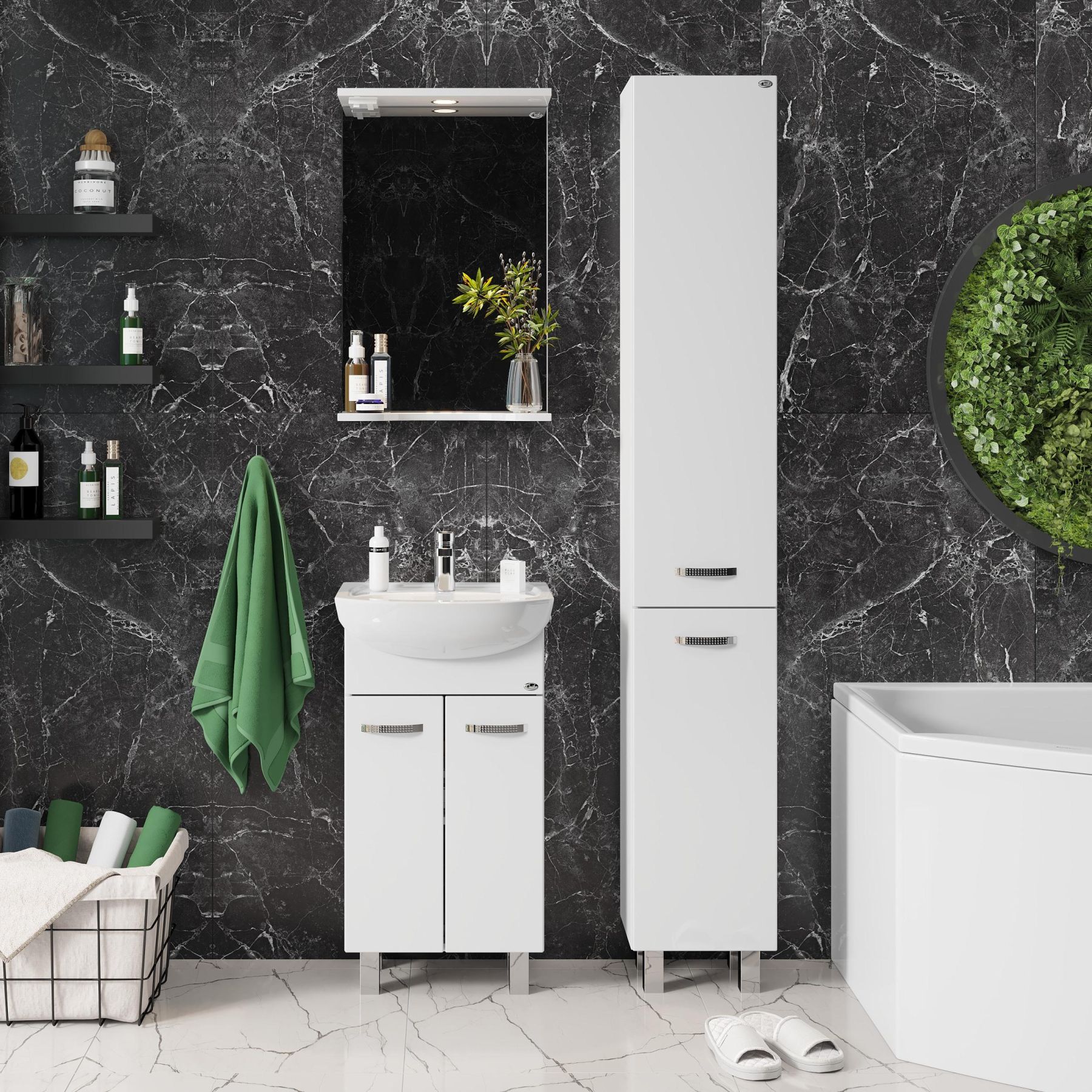 Основа для зеркала выполнена из ЛДСП, полка и козырек - из МДФ в пленке, устойчивых к механическим воздействиям, перепадам температур и высокой влажности.