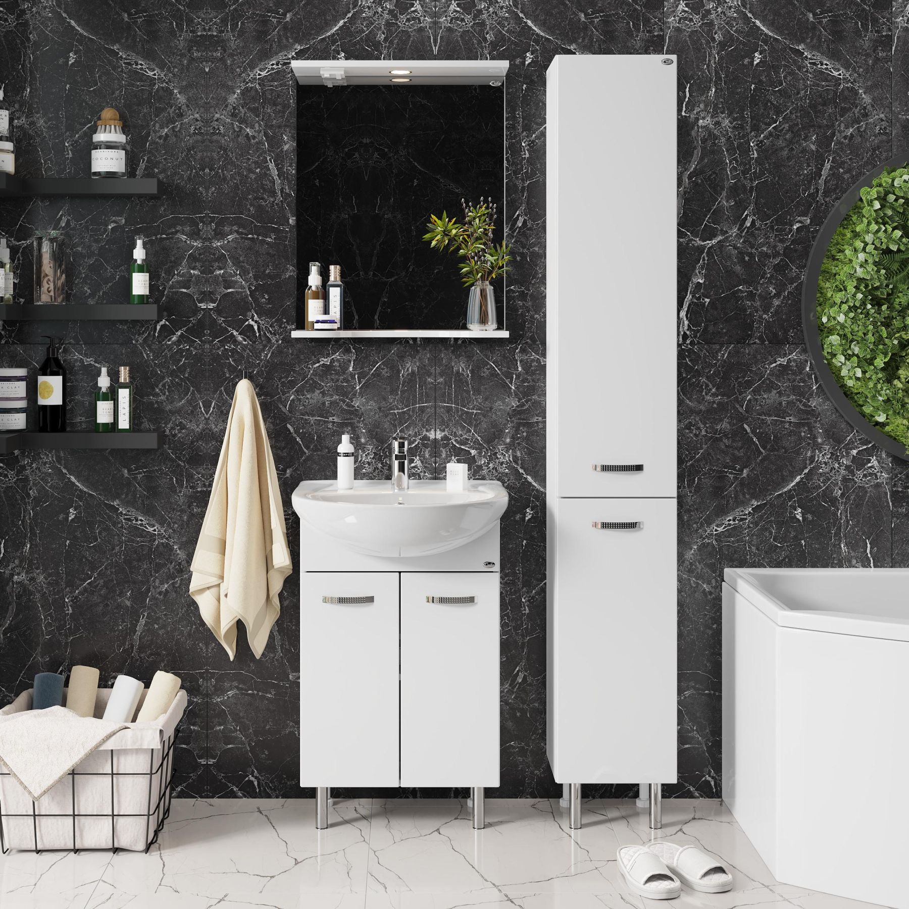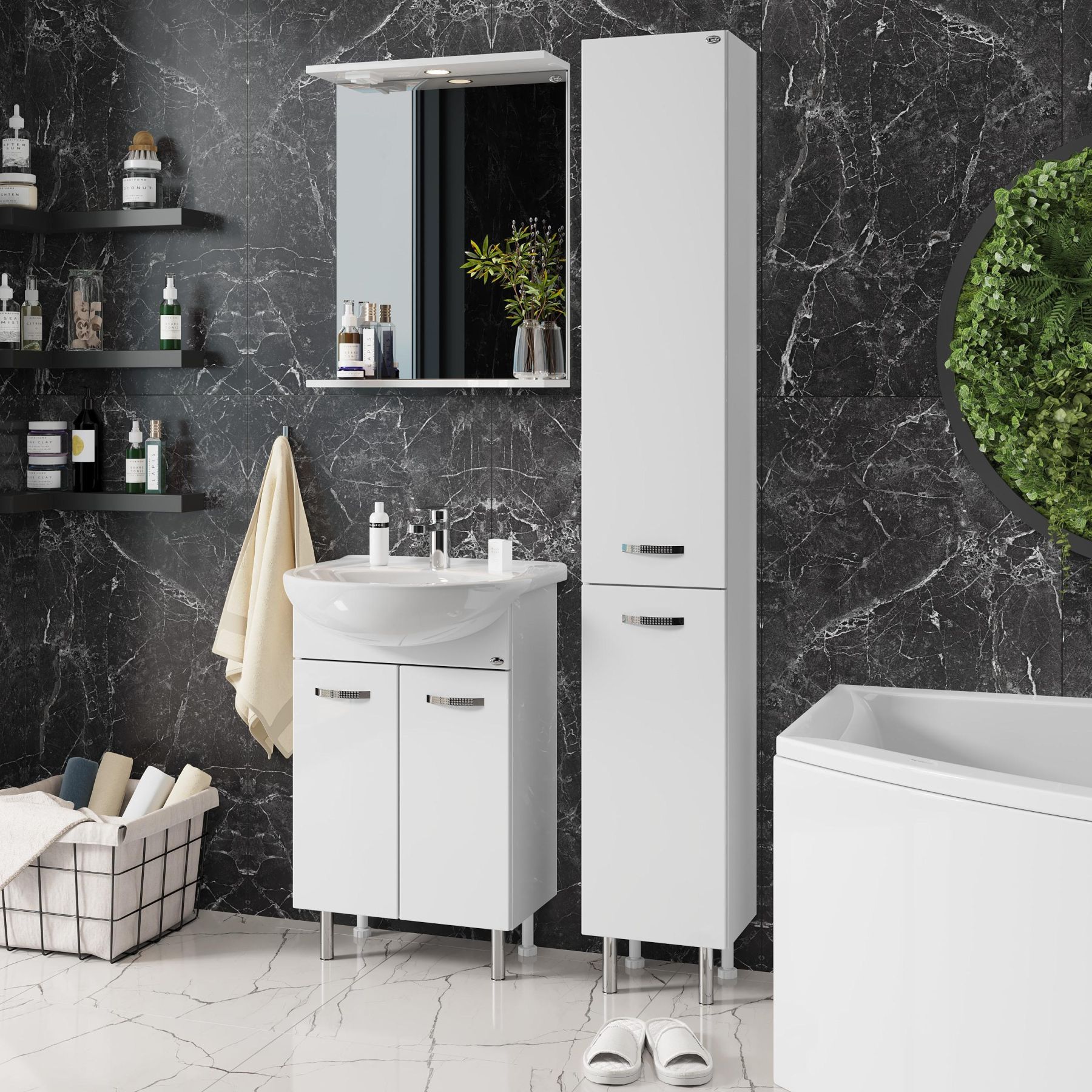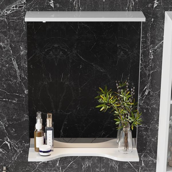 Основа для зеркала выполнена из ЛДСП, полка и козырек - из МДФ в пленке, устойчивых к механическим воздействиям, перепадам температур и высокой влажности.