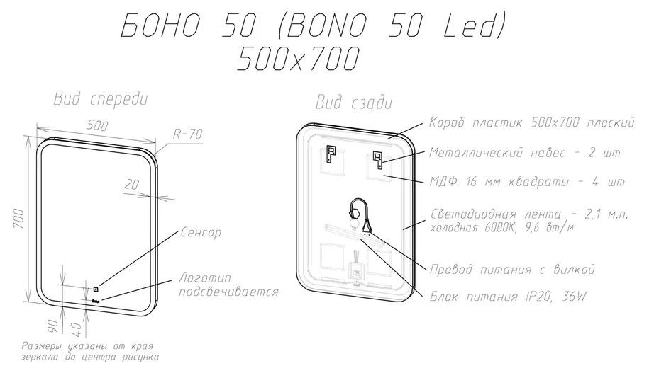 Зеркало нестенное BONO 50, 500х700 с LED подсветкой и сенсорным выключателем. Класс защиты IP44. Стеклянное зеркальное полотно Mirox производства компании AGC Glass Russia, принадлежащей международной группе мирового лидера по производству стекла AGC Inc. Можно использовать в любом помещение: ванная и туалет, прихожая, спальня, гостиная