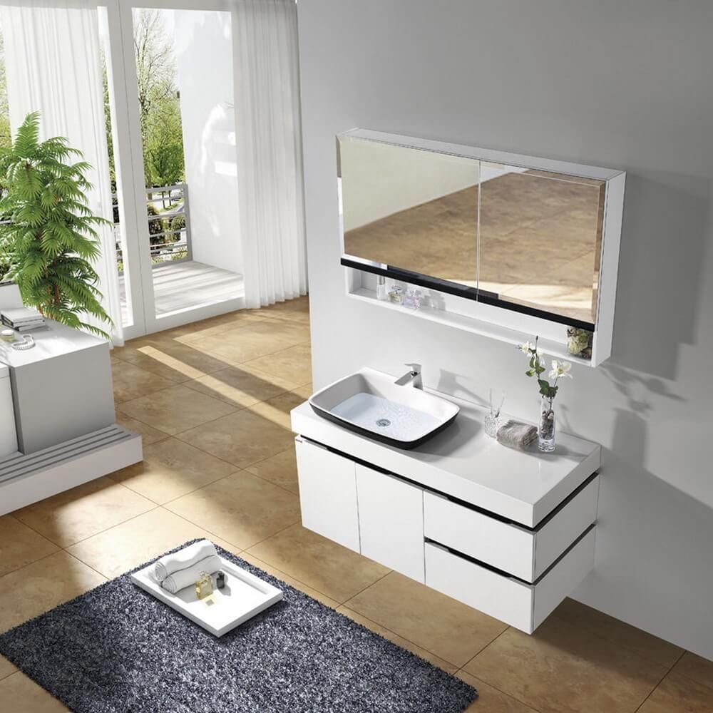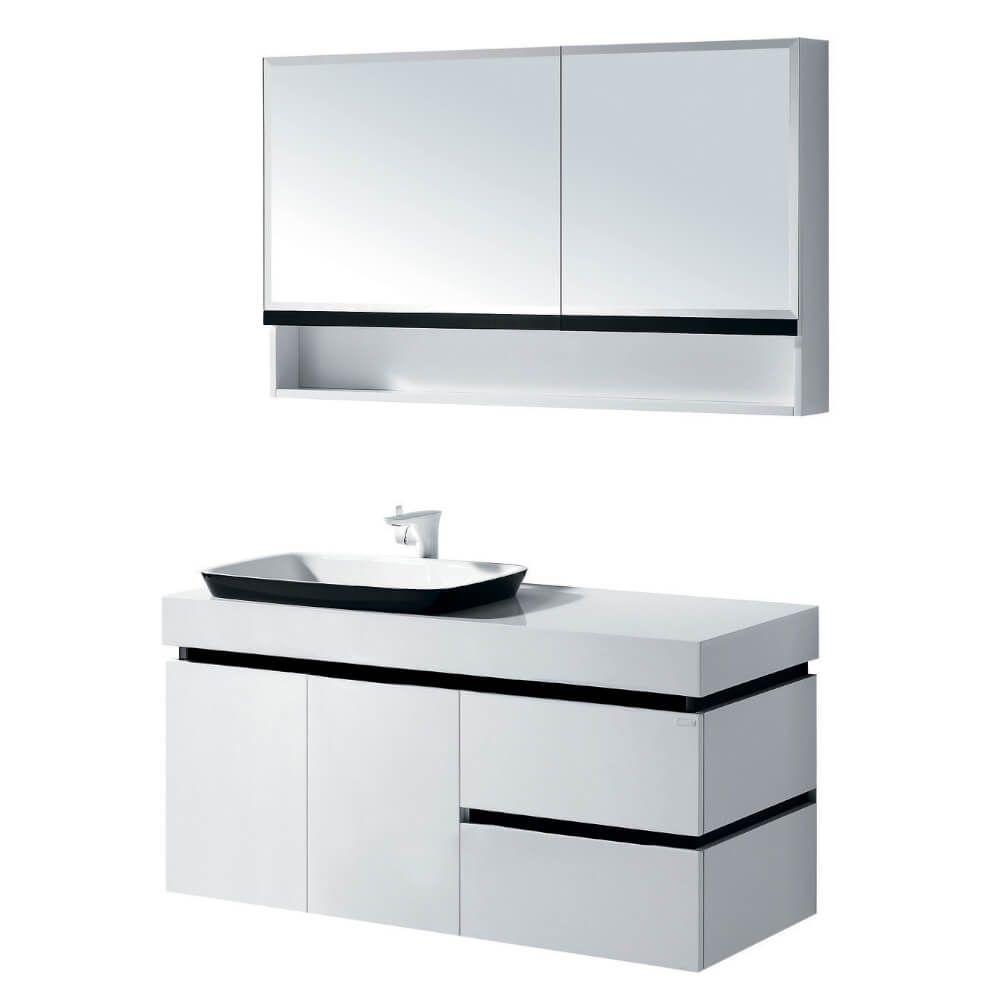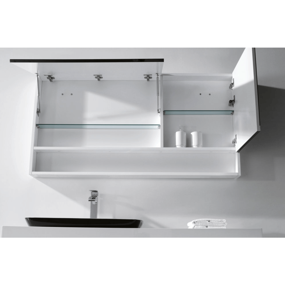 Большой зеркальный шкаф с одним распашным ящиком слева и одним распашным ящиком с дверцей, открывающийся вверх, создает неповторимое ощущение удобства, стиля и вкуса;