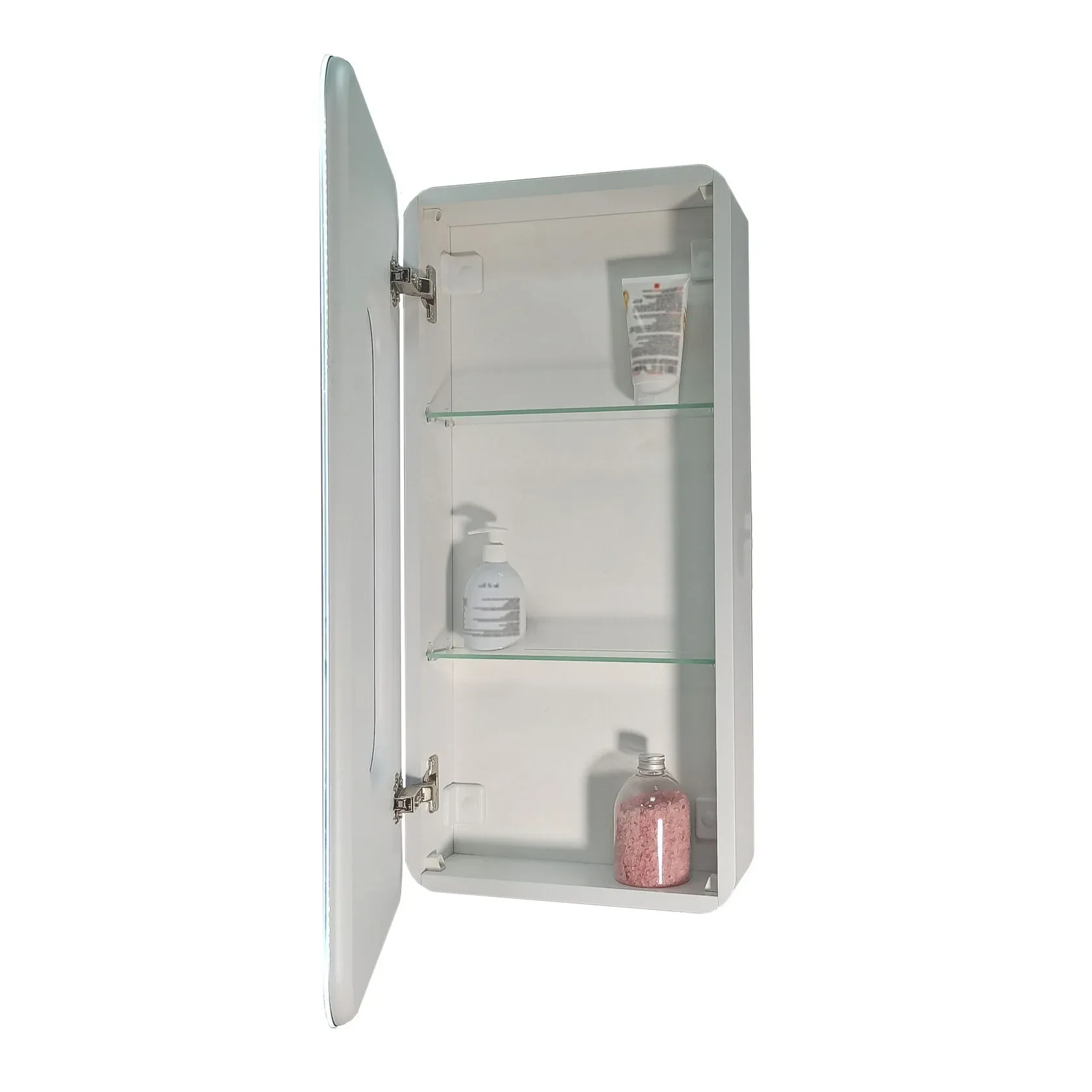 Стеклянные полки легко регулируются по высоте. Хромированные крепления не ржавеют при длительной эксплуатации в условиях повышенной влажности. Защита по стандарту IP44 обеспечивает безопасное использование устройства в условиях повышенной влажности.