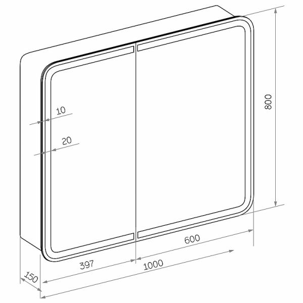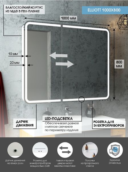 Зеркало-шкаф "Elliott LED" 1000х800 с датчиком движения, розеткойLED подсветка 6000К; датчик движения, Материал корпуса - МДФ в пленке ПВХ, розетка, две створки